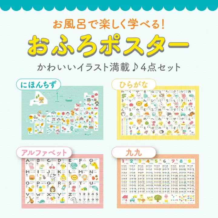 「お風呂で楽しく覚えちゃお!」は、ひらがな(カタカナ)・アルファベット・九九・日本地図の4点セット。