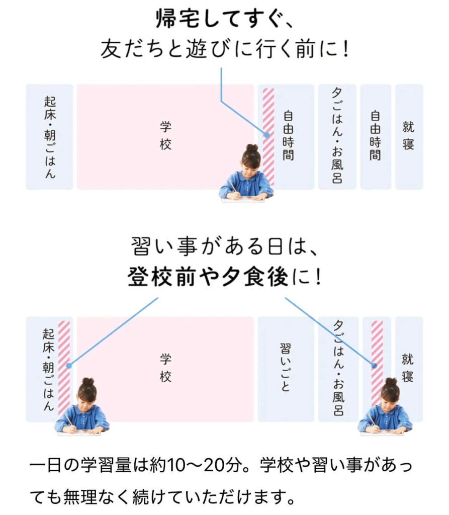 ですが、学年に応じた「集中できる時間」で設定されているので、学校や習い事などのペースを大きく崩さず継続しやすくなっています。